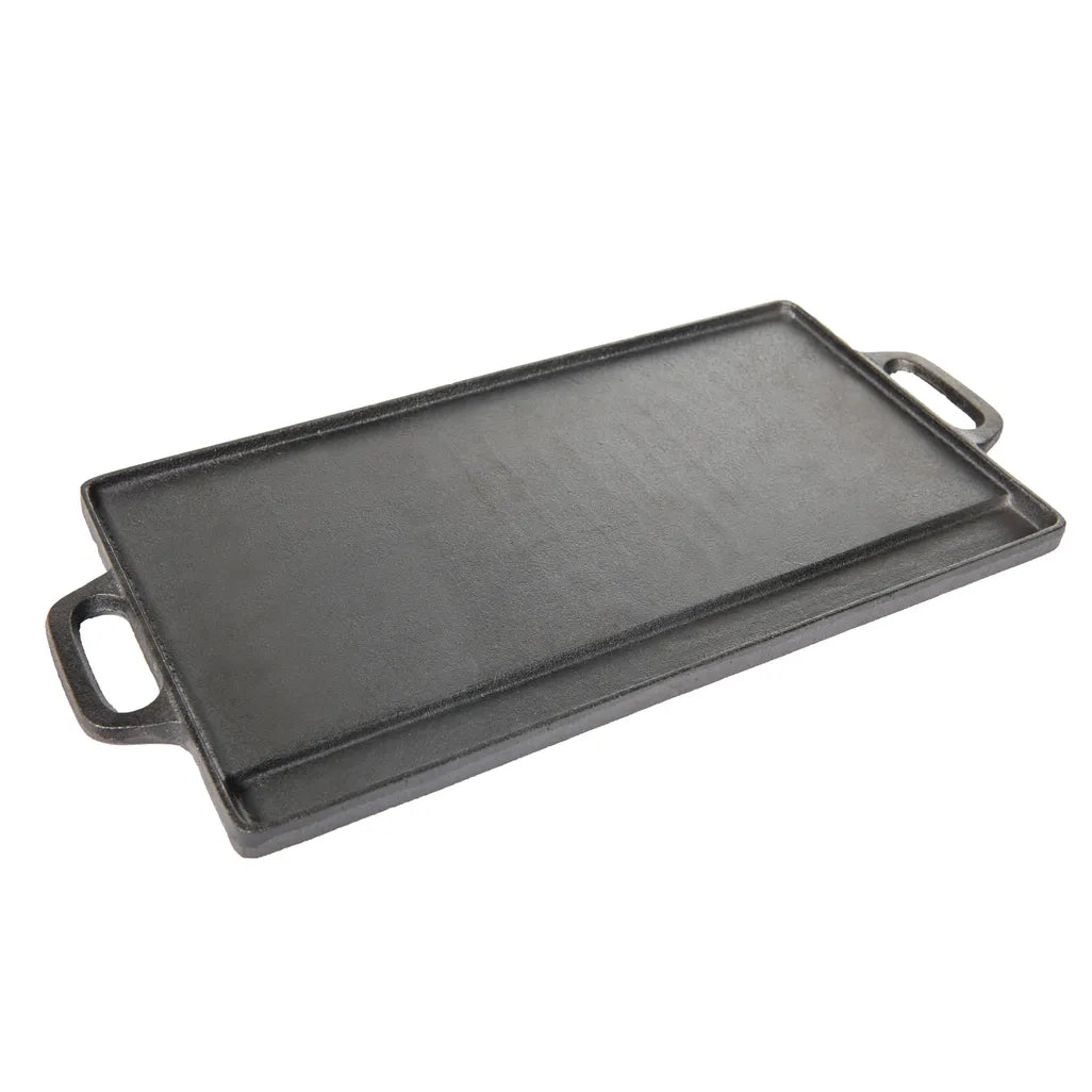 The Traeger Cast Iron Reversible Griddle offers incredible versatility for your Traeger grill. Crafted from durable cast iron, this griddle boasts a reversible design with a smooth side and a ribbed side. The smooth surface is perfect for delicate items like pancakes, hash browns, and grilled cheese, while the ribbed side excels at grilling meats such as steak, chicken, burgers, and bacon, efficiently separating fat for healthier cooking. Measuring 20 cm x 23 cm x 2.5 cm (H x W x D) and weighing 3.4 kg, this griddle provides ample cooking space and even heat distribution for consistent results. Easy-grip side handles make handling safe and convenient. The embossed Traeger logo adds a touch of style. Compatible with the Pro 575, Pro 780, and all 20 series pellet grills and smokers, this pre-seasoned griddle is ready to use right out of the box. Backed by a 1-year manufacturer warranty.